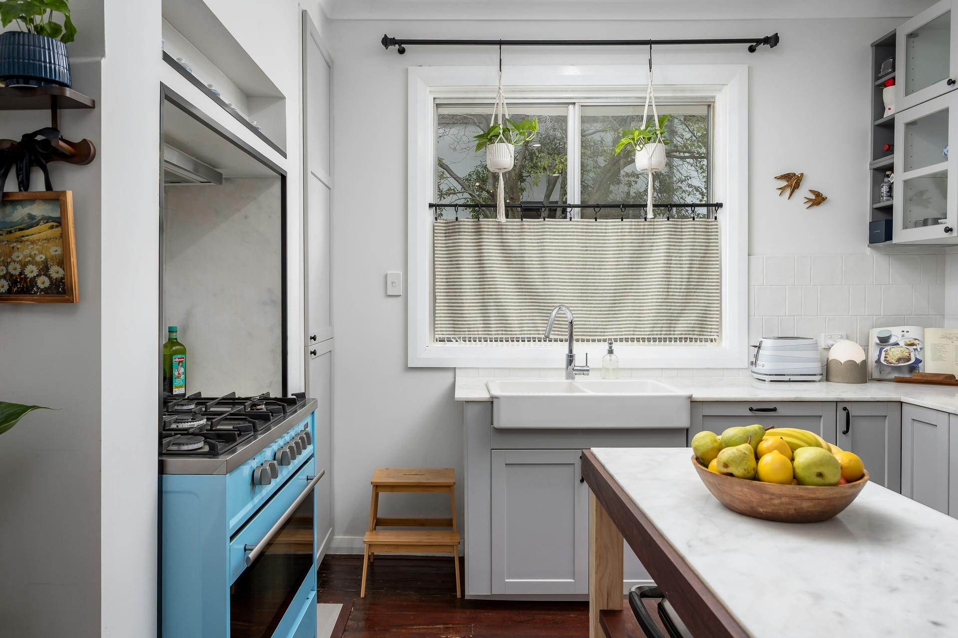 Next, the amazing kitchen, with stone benchtops and a matching inlay into the wooden island bench, a feature in the centre of the room, a big 1100 mm* freestanding "baby blue" oven is the focal point, and my favourite! With more than ample beach space, lots of under bench cupboards, and even overheads as well, the kitchen is an absolute treat.