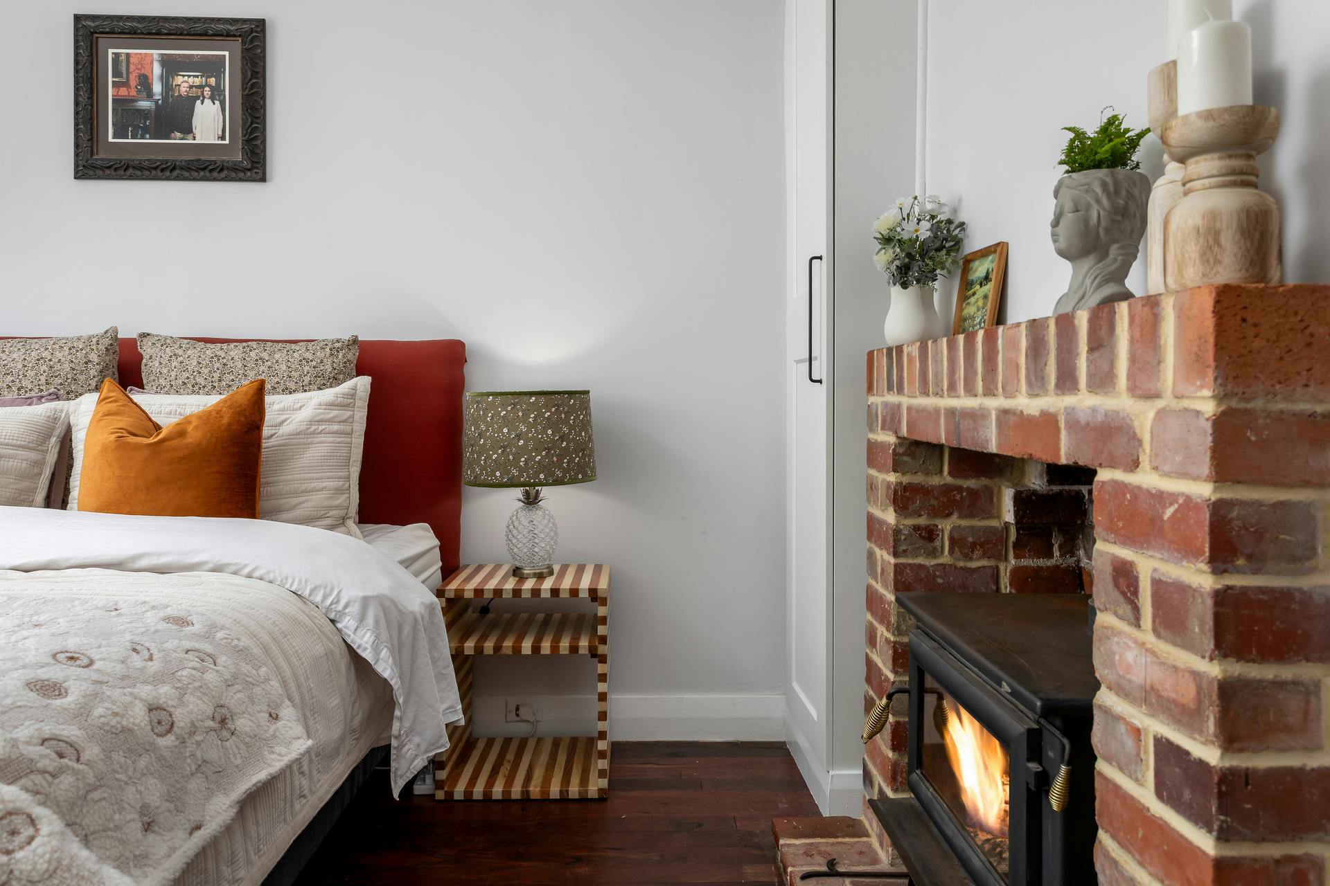 To the left of the front door, the current spacious master bedroom, with a fireplace, it's north facing and offers a sun-drenched room in winter, giving winter warmth, yet cool in summer!