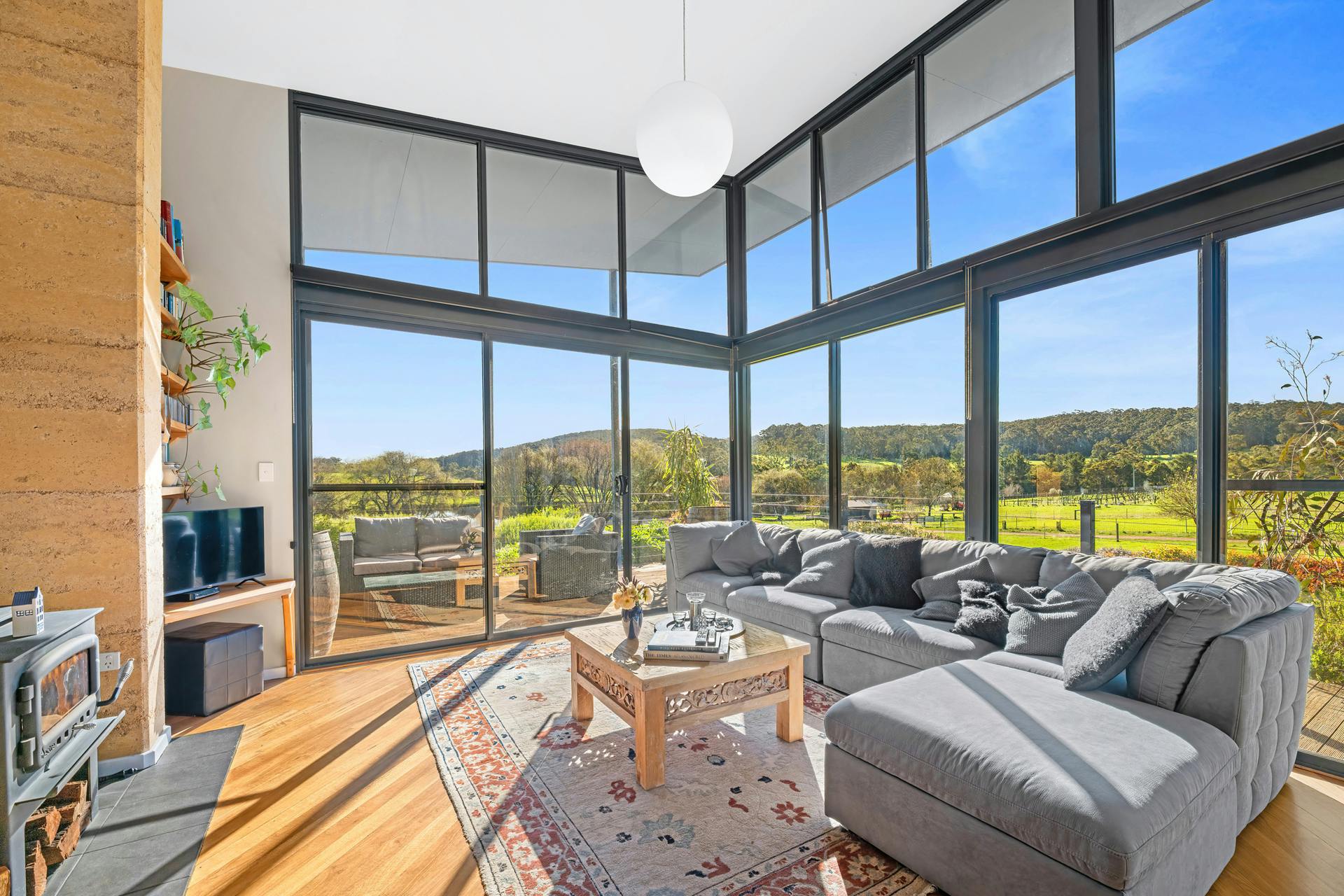The rammed-earth home is warm and beautifully built, designed to capture views of Scotsdale Valley and the Harewood forest from all rooms. Large windows frame the landscape, and the wide wrap-around verandah provides an ideal spot to take in the vineyard and surrounding countryside throughout the day.